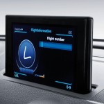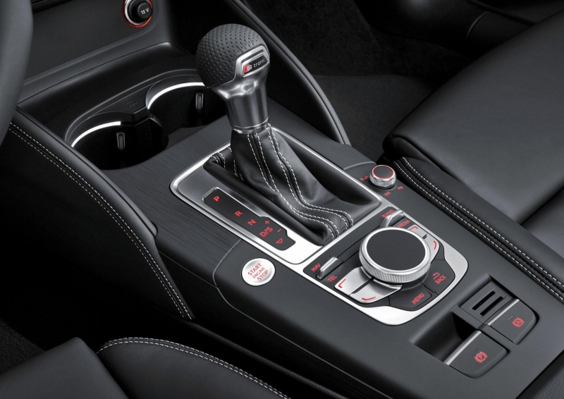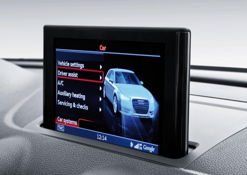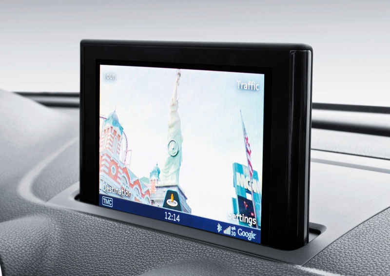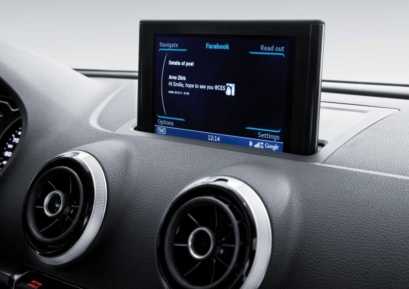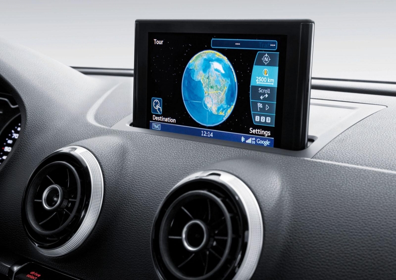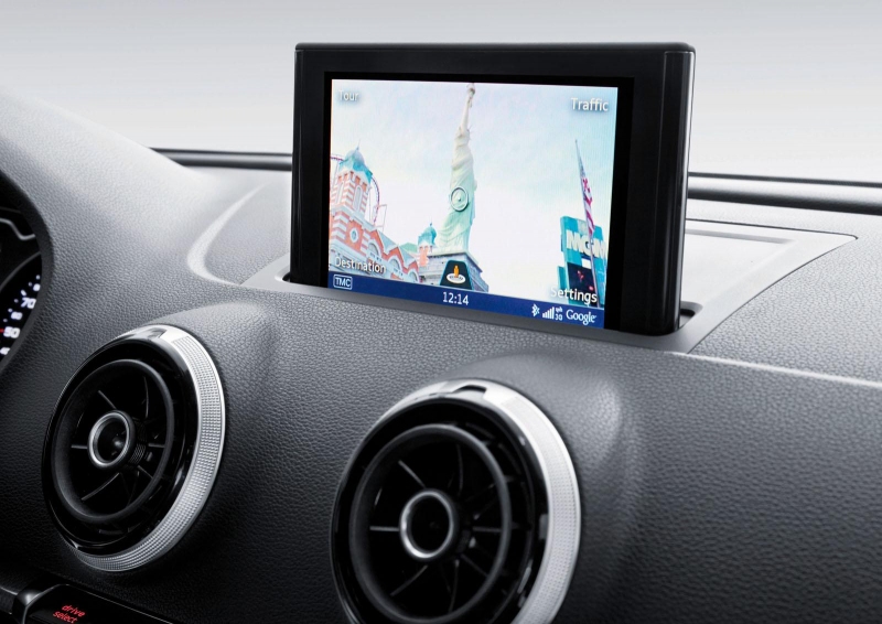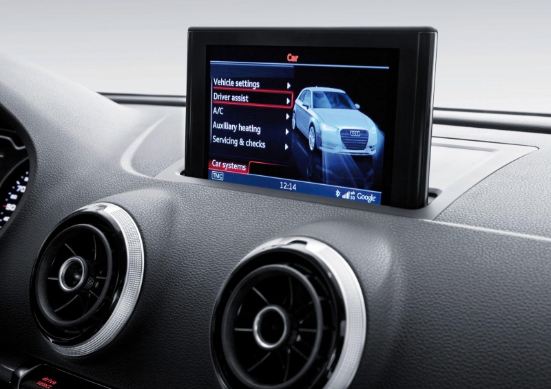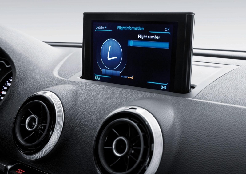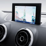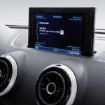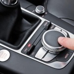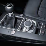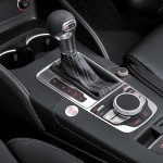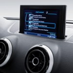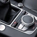 La prima cosa che si osserva e si nota, guardando queste immagini? Che la nuova Audi A3 è stata ripulita da ogni elemento superfluo e dotata soltanto dei comandi essenziali: nell’abitacolo della nuova generazione della media di segmento C si respira semplicità, ordine, pulizia, rigore. La maggior parte delle funzioni della vettura, infatti, può essere comandata attraverso il selettore rotondo che si trova dietro la leva del cambio, grazie al sistema di infotainment MMI (dotato di processore dual-core “Tegra 2” da 1,2 Ghz ed incluso nel sistema MMX – Multi-Media-eXtension – con cui sarà possibile connettersi ad internet o usare il telefono) e mediante lo schermo multifunzionale che fuoriesce su richiesta dal cuore della plancia (come si vede in queste immagini). Questa scelta (racchiudere i comandi in un unico punto ed alleggerire la consolle centrale) è chiaramente presa in prestito da BMW, che la usa dall’epoca di Chris Bangle ad oggi.