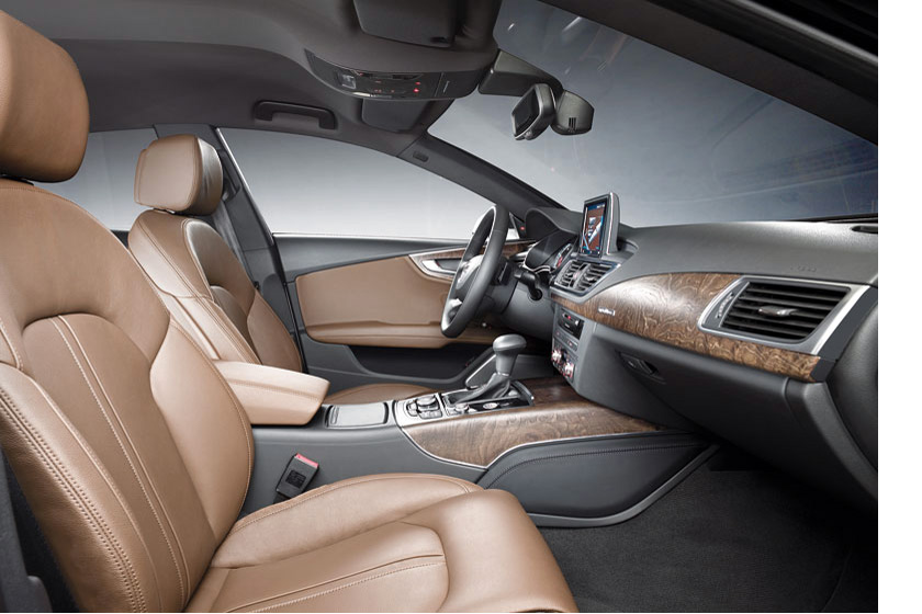 Il versante laterale della nuova Audi A7 2011 scende con un arco che non si ferma di fronte ad ostacoli di sorta e carica pesantemente il posteriore, donando alla vettura l’aspetto di una fastback: la superficie vetrata e la linea di cintura spingono la direzione visiva verso il posteriore, slanciato all’indietro, in aperto contrasto con il frontale, che, per converso, rappresenta un contraltare di pulizia, limpidezza e rigidezza: il portellone chiude la carrellata visuale e pare decisamente imponente, tanto che alla coda non resta che una misera porzione, apocopata di netto dal profilo verticale.