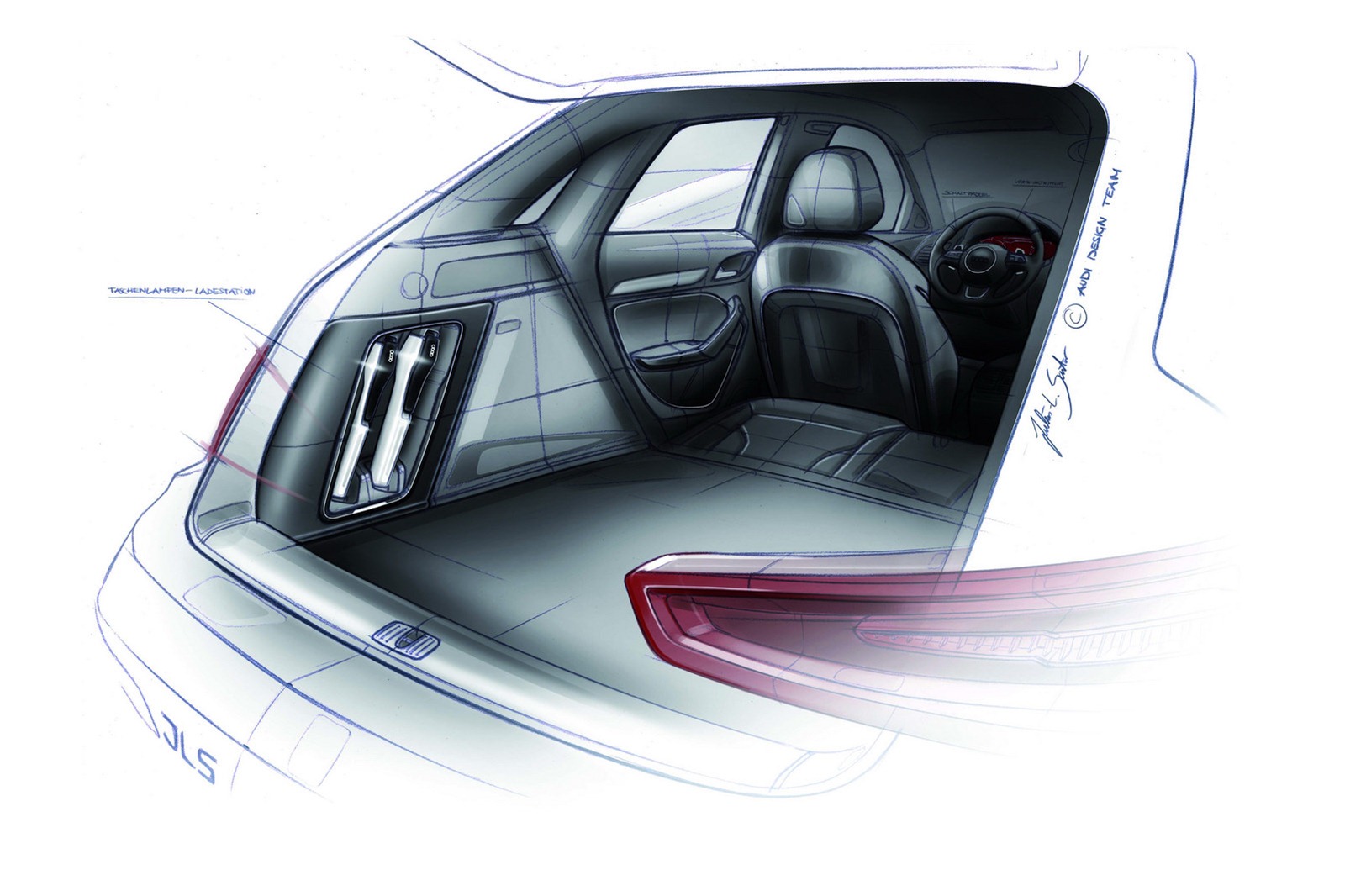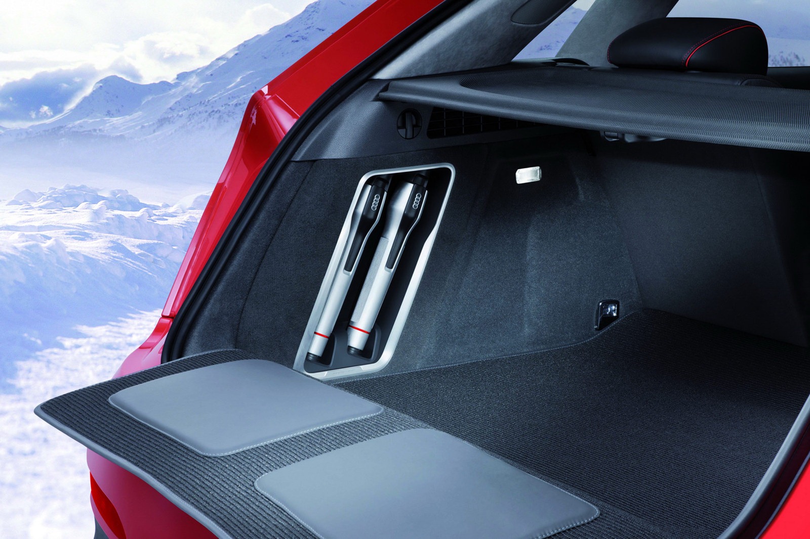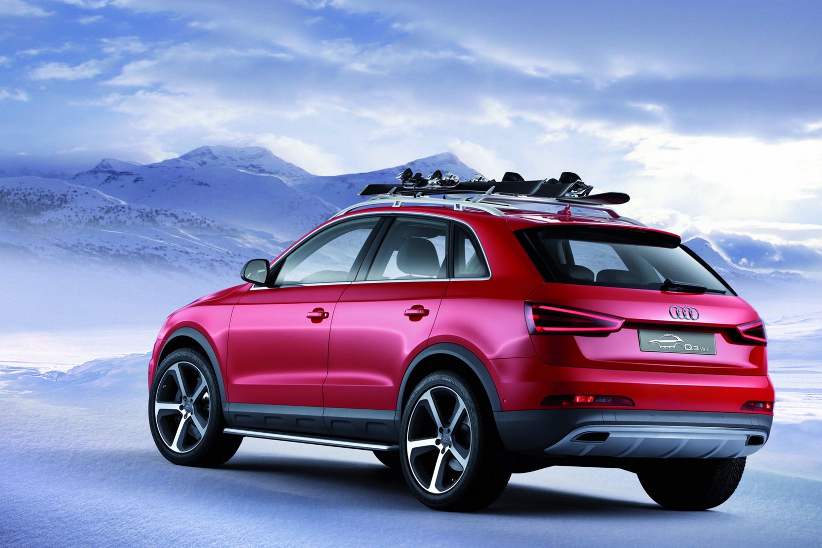 La nuova Audi Vail Concept viene caratterizzata da nuove fasce paraurti sportive, da nuovi cerchi in lega da 20 pollici, dalla nuova colorazione Energy Red con effetto perlato, da nuovi mancorrenti sul tetto con luci supplementari (a LED), dalla mascherina frontale specifica, dalla bordatura in plastica che contorna tutta la carrozzeria, dal rivestimento delle sedute in pellame Nappa, dalle decorazioni interne in alluminio e da alcuni altri dettagli esclusivi (come ad esempio il curioso e stravagante thermos alloggiato all’interno della consolle centrale del SUV tedesco).