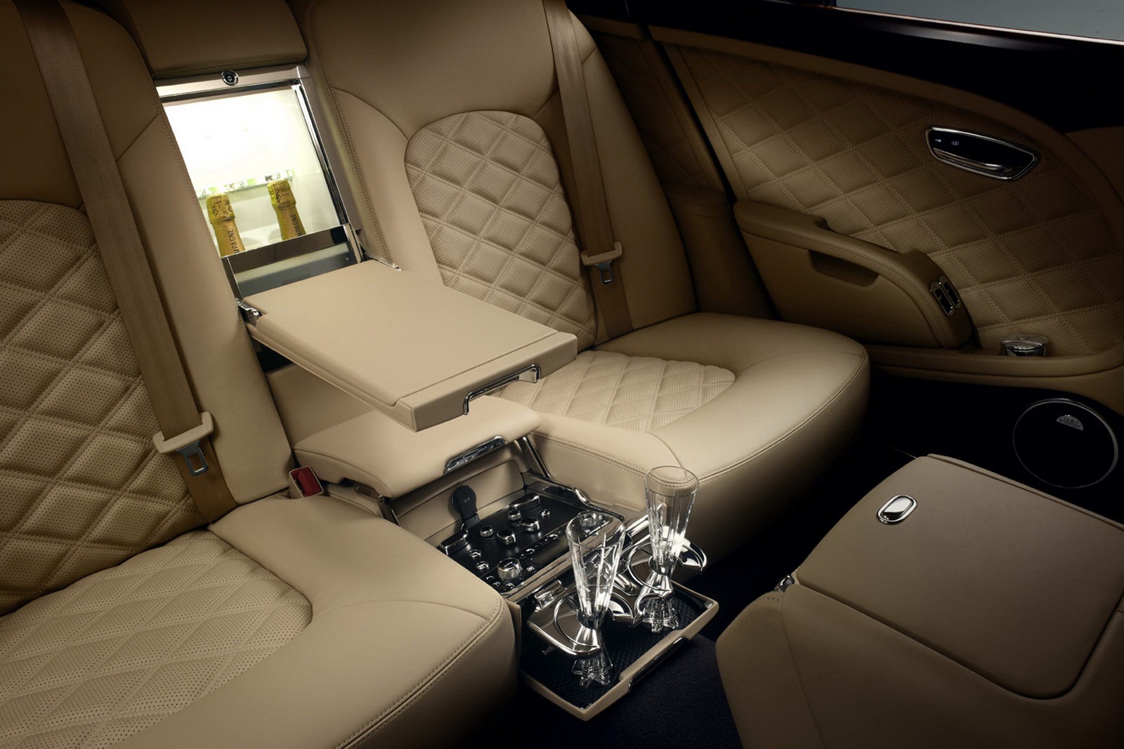 NUOVI OPTIONAL Con l’occasione del debutto della nuova Bentley Mulsanne Mulliner, la casa automobilistica inglese ha introdotto nella sconfinata lista di accessori della vettura due nuovi elementi, cioè un porta-bevande posteriore refrigerato con calici in cristallo ed un tetto in vetro scorrevole e apribile fumé.