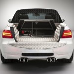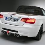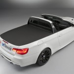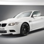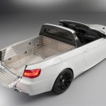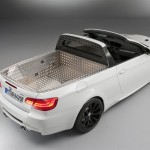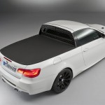 Nella parte posteriore della nuova BMW M3 pick-up, la casa automobilistica ha creato un vano di carico rivestito in alluminio, che può accogliere sino a 450 chilogrammi di bagagli e fino a 20 sacche da golf (in sostanza, l’abitacolo è stato tagliato subito dopo le due sedute posteriori). Nonostante questo e nonostante l’irrigidimento del telaio, per far fronte alla scomparsa di una parte della carrozzeria, la nuova BMW M3 pick-up è più leggera di circa 50 chilogrammi rispetto a BMW M3 Cabrio (che pesa 1.810 chilogrammi). L’azienda dell’Elica di Monaco ha inoltre previsto e plasmato per la nuova BMW M3 pick-up un tetto di circa 20 chilogrammi (disponibile a richiesta, suppongo), che chiude lo striminzito abitacolo e che permette di trasformare la vettura in un modello “targa”. Il resto è il solito: BMW M3 pick-up è la sportiva che già abbiamo conosciuto come berlina, come coupé e come cabriolet e anche se manca una parte della carrozzeria la linea resta quasi immutata.