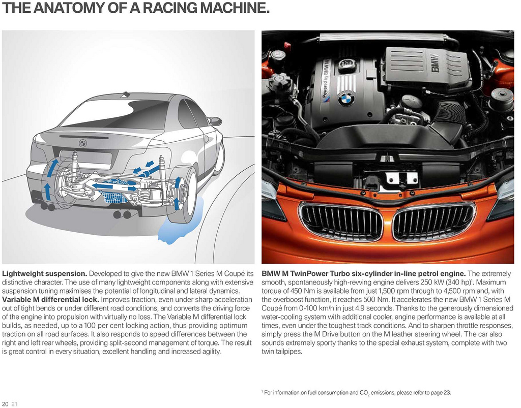 Presentata pochi giorni fa, la nuova BMW Serie 1 M Coupé è la meno impegnativa, per dimensioni e potenza, tra le automobili della divisione M della casa automobilistica dell’Elica di Monaco. Per questo, è la più accessibile, anche ad una nuova gamma di clienti, più giovani, meno facoltosi, forse. Il costruttore di Monaco ha diffuso inedite immagini della coupé sportiva, grazie anche al catalogo ufficiale (che siamo già ora in grado di mostrarvi, nonostante il debutto avverrà al Salone di Detroit 2011, durante il prossimo gennaio, ed il lancio sul mercato sia previsto non prima della primavera dell’anno venturo).