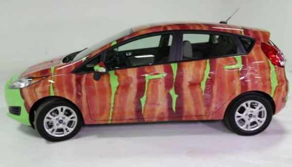 Infatti, il brand a stelle e strisce ha voluto sviluppare una Ford Fiesta del tutto particolare. In poche parole, si tratta di una vettura che presenta una livrea unica nel suo genere: è sufficiente dare un’occhiata alla presenza di un gran numero di pellicole adesive, che vogliono rappresentare le fette di bacon.