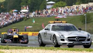 Al 15° giro però, la corsa cambia radicalmente la sua storia. Un pezzo di alettone volato sulla pista induce i commissari a schierare la Safety car: da quale momento in poi succede davvero di tutto nello spazio di pochi minuti. Vettel ha tagliato con una manovra al limite dell’incidente e della penalità, la linea bianca della corsia di rientro ai box per cambiare immediatamente le gomme seguito subito dalla Ferrari di Alonso, da Hamilton e Massa. Webber ha invece proseguito. Nella grande concitazione del rientro ai box, Rosberg perde un pneumatico che schizza a tutta velocità seminando la paura tra i meccanici degli altri team (sarà colpito alla spalla un uomo della Williams). Kubica invece, riceve il via dai suoi meccanici che non si accorgono dell’arrivo proprio della Force India di Sutil: inevitabile lo scontro tra i due (Sutil si ritira mentre il polacco è ripartito dopo una riparazione lampo beccandosi però una penalità per la manovra).
