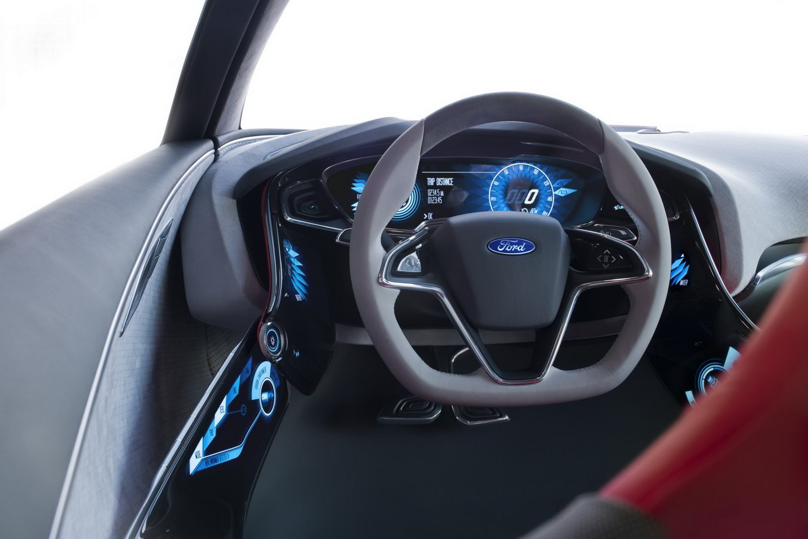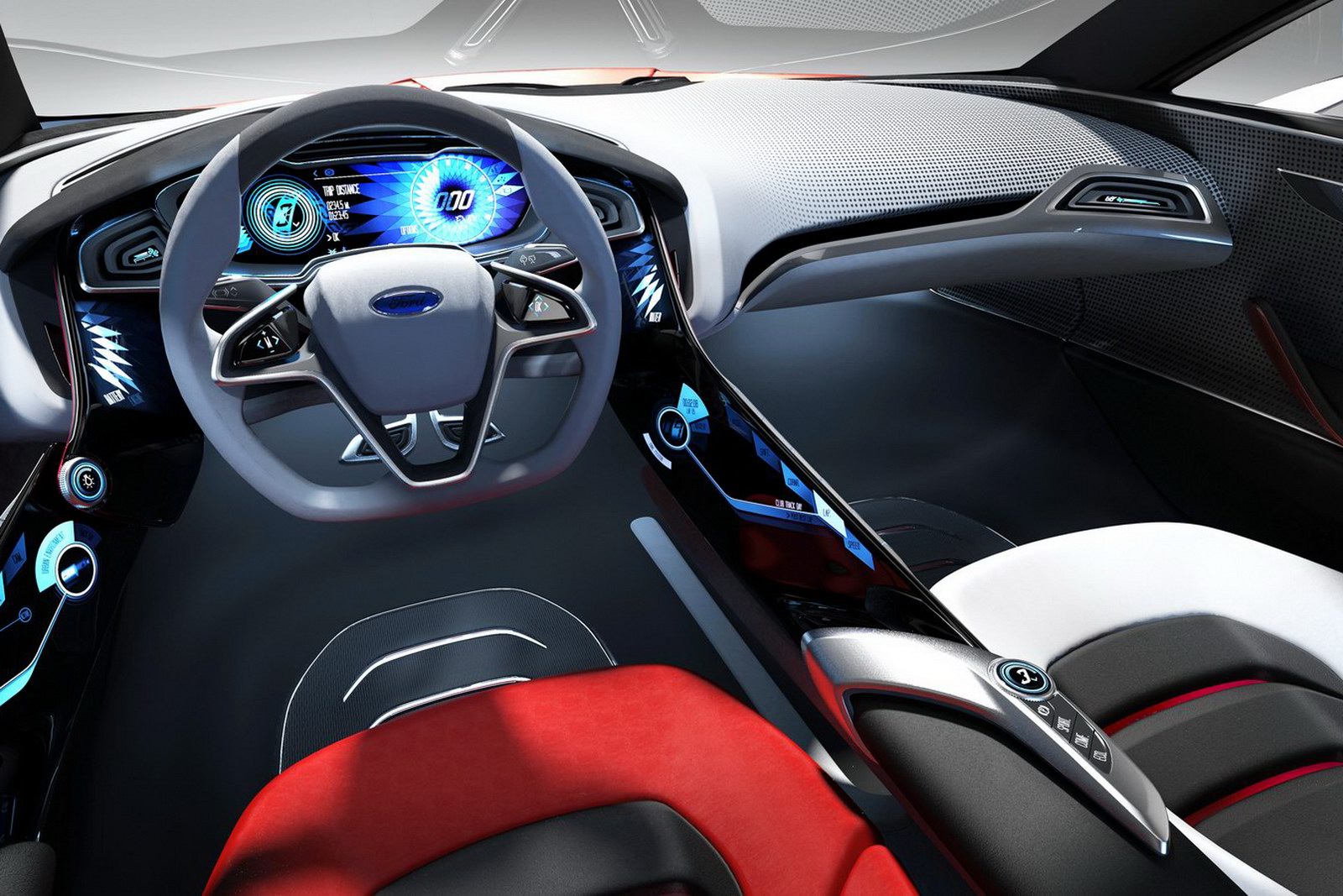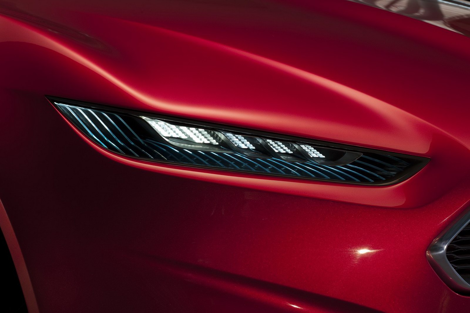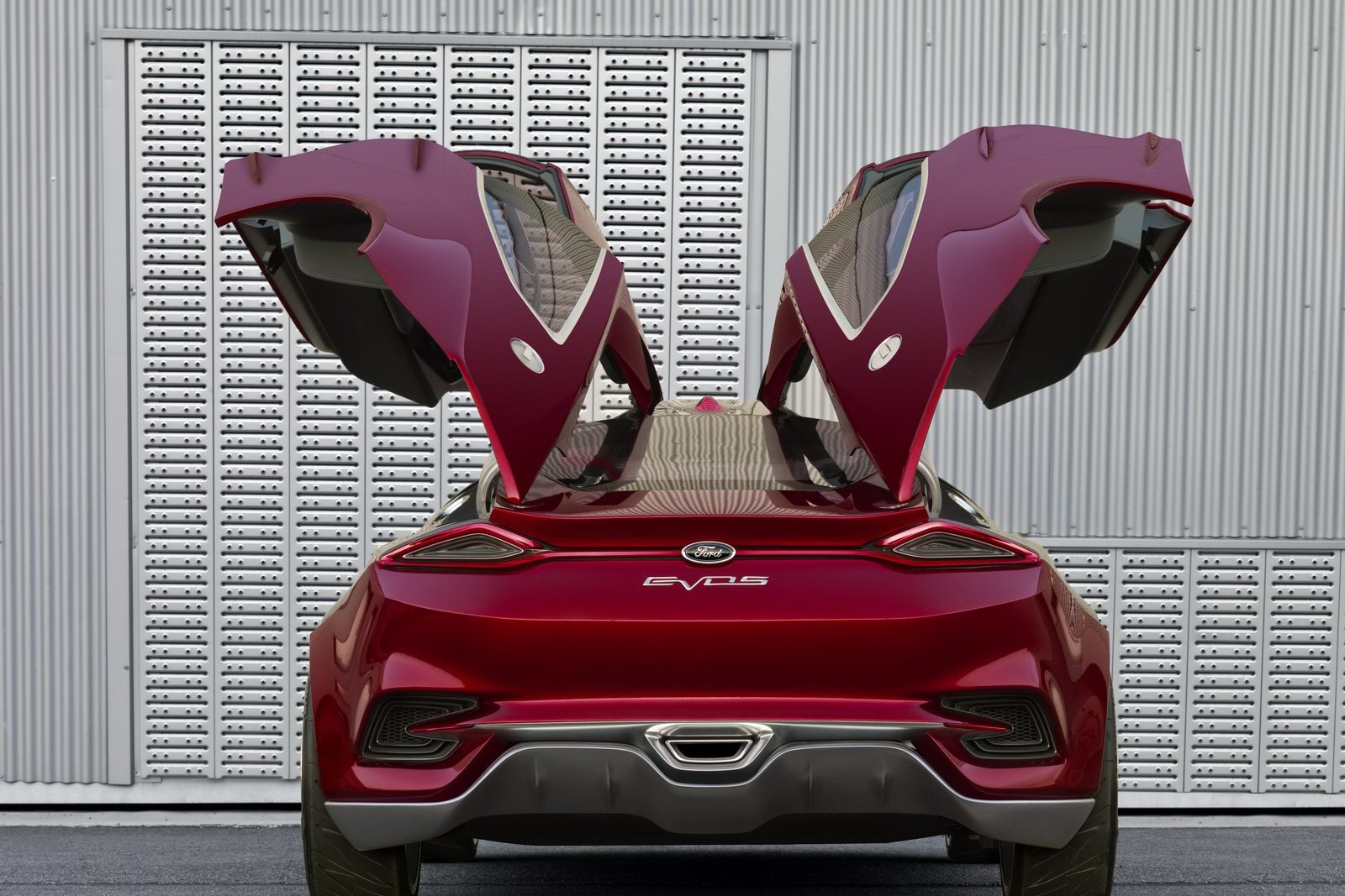 Sulla carrozzeria dolce della nuova Ford Evos Concept, senza dubbio, l’elemento di maggiore importanza è la mascherina centrale-frontale: la casa automobilistica ha deciso di utilizzare quell’apertura a forma di trapezio come segno distintivo di tutti i veicoli da questo momento (come Audi usa la griglia single-frame, così Ford ha deciso di impiegare questo particolare elemento, che però forse somiglia un po’ troppo alla mascherina di Aston Martin). Le portiere ad ali di gabbiano, quelle no, non diventeranno una caratteristiche delle Ford di domani.