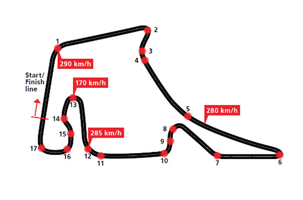 Il setup richiesto è per un medio/alto carico aerodinamico. La velocità massima raggiungibile sul rettilineo grazie all’ausilio del DRS è 326 Km\h.