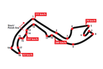 Carburante: il 45% del giro è impiegato con l’acceleratore premuto ( il più basso dell’anno). Per percorrere l’intera gara ci vogliono 120 kg di benzina. In ogni giro si consumano 1,55 kg.