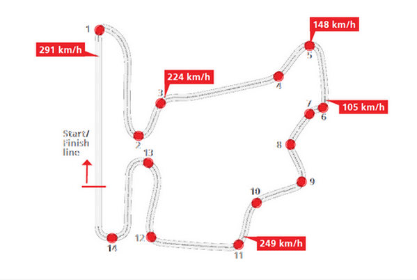 PRONOSTICO – Il circuito è adatto alla Red Bull. Alto carico aerodinamico e curve lente. Ovviamente bisognerà vedere se le modifiche sulle mappature del motore che la FIA ha imposto, incideranno sul rendimento della macchina. Diversamente dagli scorsi anni, la Ferrari riesce ad adattarsi bene, mentre Lotus e McLaren rendono meglio su piste con curve a media-alta velocità e dove si utilizzano gomme morbide.