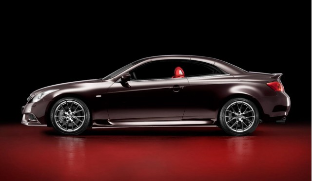 All’esterno, la matita rimane comune con Infiniti G37 Cabrio e le modifiche richiamano la prima autovettura che il comparto IPL ha elaborato: Infiniti G Coupé. L’intervento inizia sulla lamiera, con una nuova verniciatura nella cromia Malbec Black, dotata di riflessi rossastri. E poi: appendici aerodinamiche anteriori, nuova fascia inferiore sotto la mascherina brunita, calotte dei gruppi ottici anteriori oscurate, diffusore posteriore con i due terminali di scarico laterali inglobati, spoiler, minigonne e pneumatici in lega da 19 pollici a sette doppie razze bruniti.