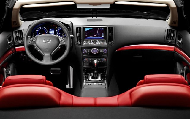 All’interno dell’abitacolo della nuova Infiniti Performance Line G Cabrio Concept, la divisione di personalizzazione ha previsto il rivestimento delle sedute in pellame Monaco Red ed un inserto rosso abbinato, che momentaneamente paiono essere le uniche caratteristiche specifiche della versione IPL.