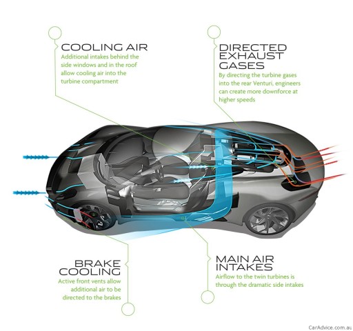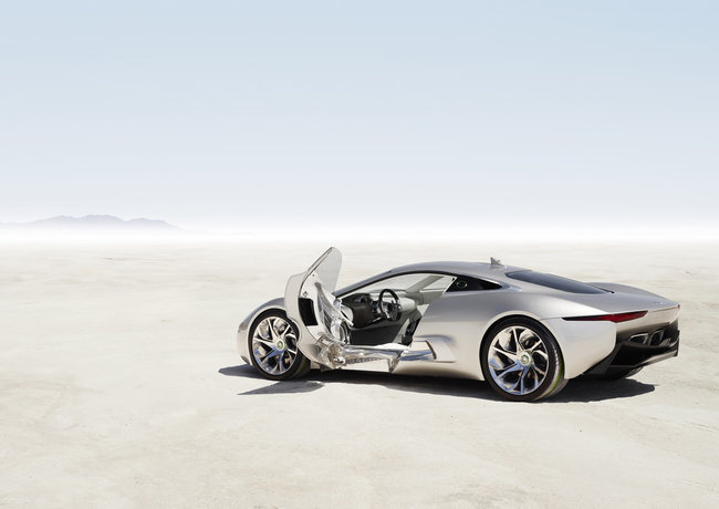 La supercar Jaguar C-X75 è stata disegnata sotto l’attenta supervisione dell’attuale Direttore del Design della casa automobilistica, Ian Callum, con un linguaggio stilistico che elabora l’attuale matita (quella dell’odierna generazione di Jaguar XJ e della berlina di segmento E, Jaguar XF) e la fa più emozionante, tanto all’esterno della fastback quanto all’interno dell’abitacolo. La vera innovazione di Jaguar C-X75, ad ogni modo, è ciò che si nasconde al di là del puro e mero belletto: il telaio in alluminio cela una serie di micro-turbine da 35 chilogrammi, che lavorano ad 80.000 giri/minuto e che erogano circa 70 kW ciascuna, sfruttando differenti tipi di carburante (tra cui diesel e GPL). Producono energia che viene immagazzinata nelle batterie agli ioni di litio e che viene utilizzata da quattro motori elettrici, uno per pneumatico (dunque, la supercar Jaguar C-X75 viene dotata di trazione integrale senza componenti meccaniche, regolabile all’infinito ed indipendentemente per ogni ruota), che insieme sviluppano 780 cavalli e 1.600 Nm di coppia massima, disponibile – quest’ultima – quasi istantaneamente. Con un’autonomia complessiva che può arrivare a novecento chilometri ed un tasso medio di emissione di anidride carbonica, dichiarato, pari a 28 chilogrammi per chilometro percorso, la nuova Jaguar C-X75 potrebbe cancellare, in un soffio, la leggenda delle automobili sportive arroganti nei confronti di Madre Natura (che, poi, tanto leggenda non è).
