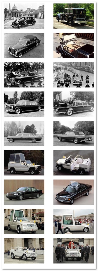 Prodotta da Mercedes-Benz, quest’auto con i suoi diversi modelli ha fatto compagnia ai Papi che si son succeduti dal lontano 1930 fino ai giorni nostri, quando (precisamente lo scorso giugno), c’è stato l’arrivo in Vaticano di una V-8 Volvo XC90 accompagnata poi da una Mercedes-Benz G-Class personalizzata, creata negli ultimi due anni tramite consultazioni private tra il Vaticano e la casa automobilistica.