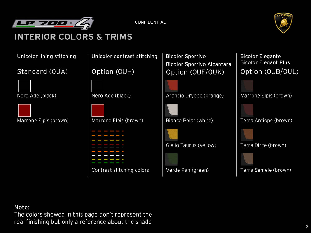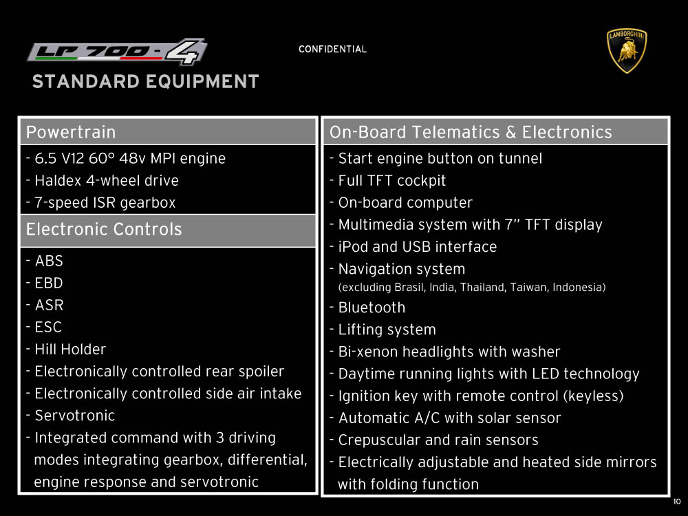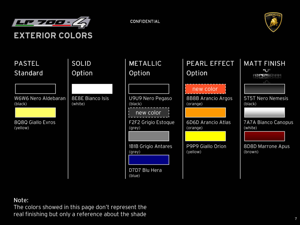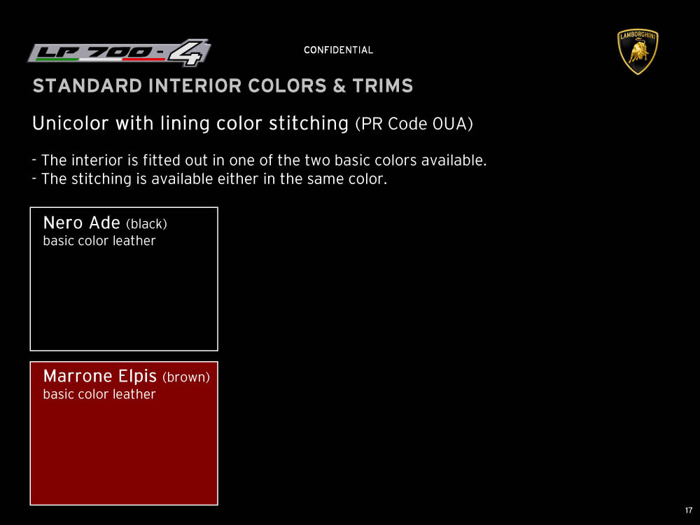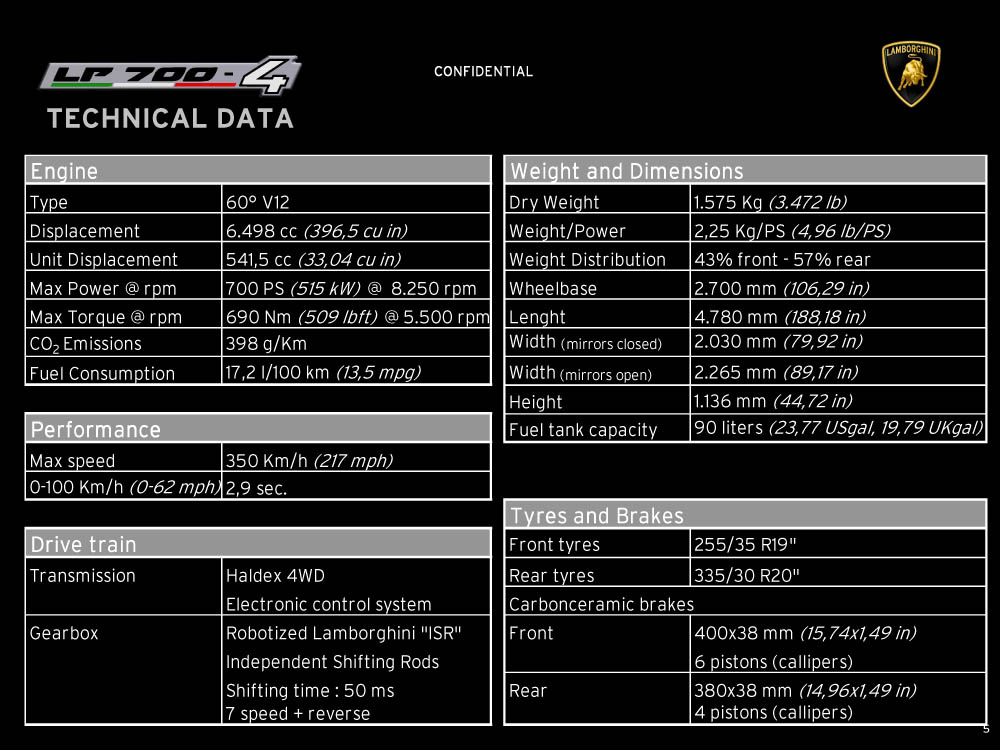 Sviolinate (a scatola chiusa) e successi (in pre-ordine) a parte, la nuova Lamborghini Aventador LP 700-4 viene equipaggiata con un motore 6,5 litri V12 benzina di nuova progettazione, in grado di erogare 700 cavalli e 690 Nm di coppia, con il cambio automatico IPS a sette marce e doppia asta, con un impianto freni (ovviamente in carboceramica) di dimensioni ingenti, con fibra di carbonio, con materiali compositi, con una lista eterogenea e abbondante di colorazioni e di accostamenti, per l’interno e per l’esterno della supercar, e con una serie di altri accessori, che è possibile leggere e conoscere grazie al catalogo di Aventador che è sfuggito al controllo di Lamborghini (per chi conosce l’inglese). Mancano, all’appello, prezzo di listino della nuova Lamborghini Aventador e foto ufficiali: un regalino di Natale?