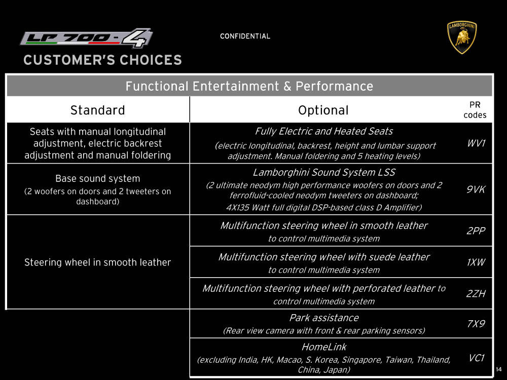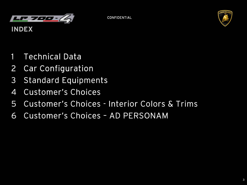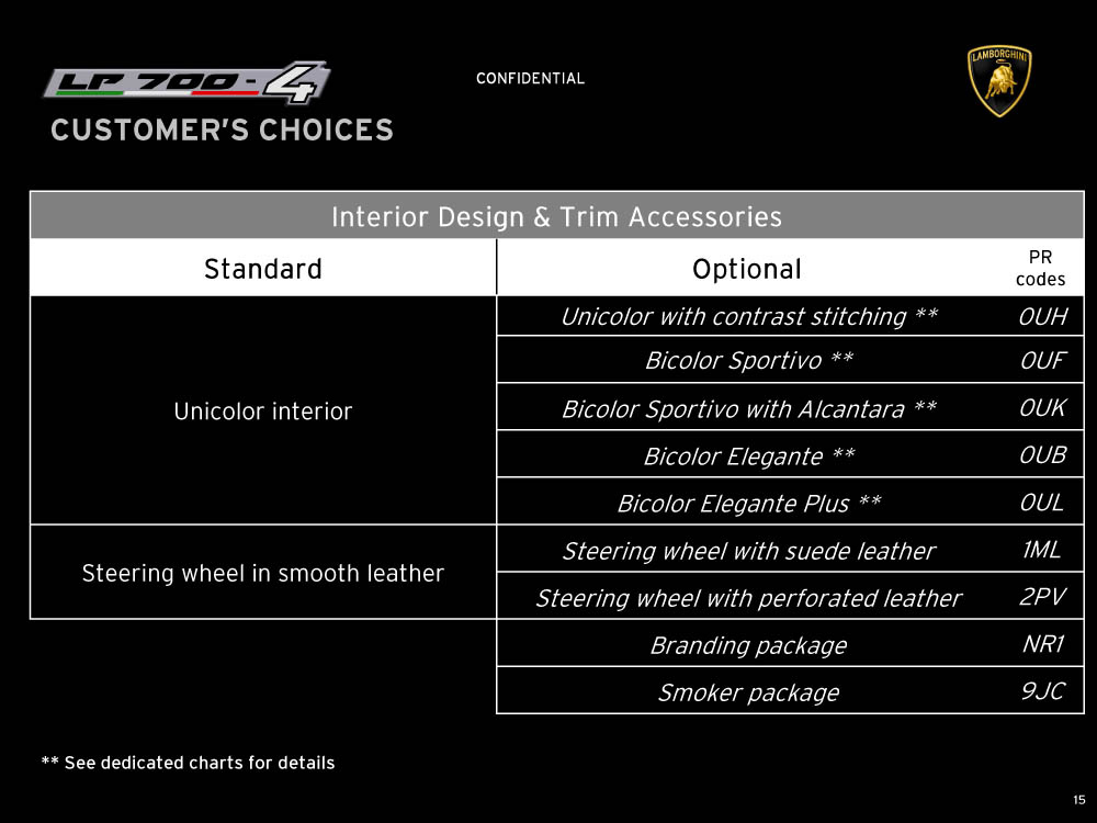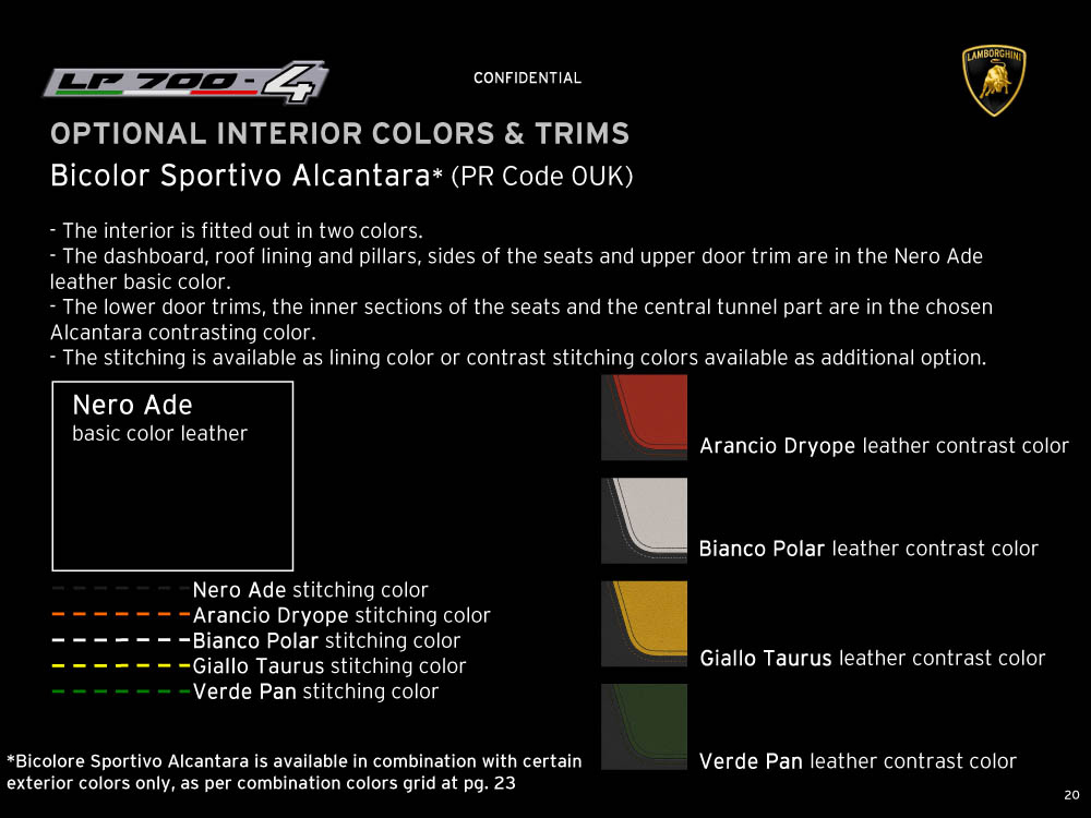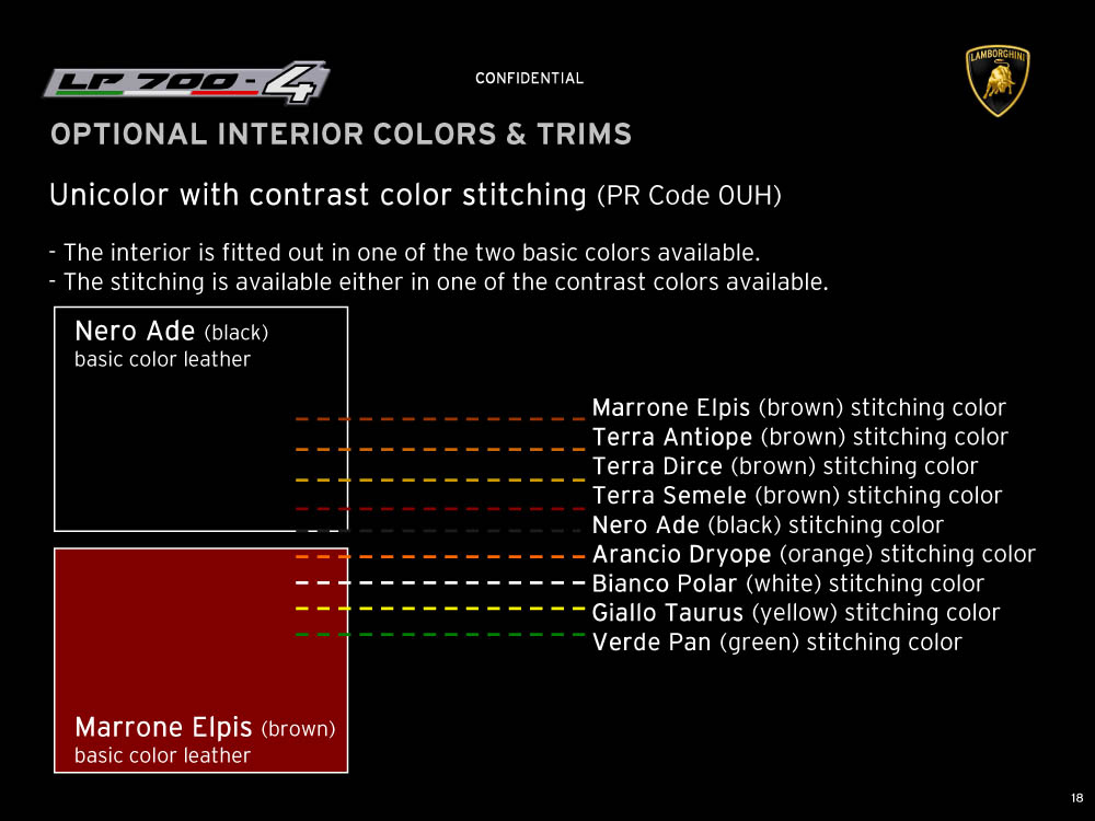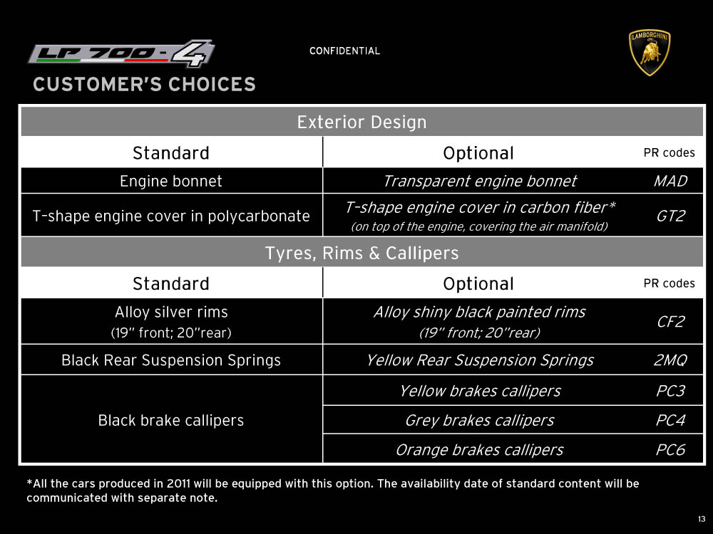 Sviolinate (a scatola chiusa) e successi (in pre-ordine) a parte, la nuova Lamborghini Aventador LP 700-4 viene equipaggiata con un motore 6,5 litri V12 benzina di nuova progettazione, in grado di erogare 700 cavalli e 690 Nm di coppia, con il cambio automatico IPS a sette marce e doppia asta, con un impianto freni (ovviamente in carboceramica) di dimensioni ingenti, con fibra di carbonio, con materiali compositi, con una lista eterogenea e abbondante di colorazioni e di accostamenti, per l’interno e per l’esterno della supercar, e con una serie di altri accessori, che è possibile leggere e conoscere grazie al catalogo di Aventador che è sfuggito al controllo di Lamborghini (per chi conosce l’inglese). Mancano, all’appello, prezzo di listino della nuova Lamborghini Aventador e foto ufficiali: un regalino di Natale?
