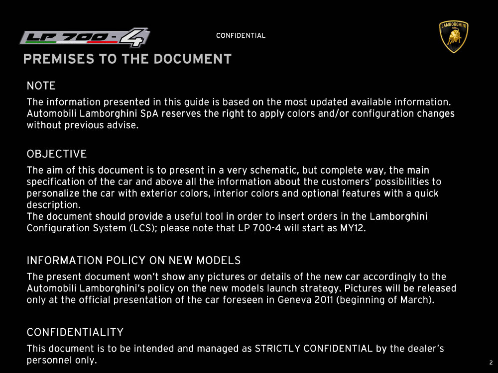 La nuova Lamborghini Aventador viene quasi completamente svelata da un catalogo riservato ed esclusivo, destinato all’uso dei dealers internazionali e diffuso via internet: la supercar di Sant’Agata Bolognese sarà una delle principali (e numerose) novità del Salone di Ginevra 2011, in programma a marzo (3-13) dell’anno prossimo, e sta catalizzando la nostra attenzione sin da ora, quando mancano ancora tre mesi all’ufficiale debutto. Ma non soltanto in Europa la si attende: la casa automobilistica italiana, che fa parte del colosso motoristico di Wolfsburg, il Gruppo Volkswagen, durante le scorse settimane ha mostrato, con eventi privati, a selezionati e probabili compratori, in Asia (in alcune città cruciali per lo sviluppo in oriente del Toro), la nuova Lamborghini Aventador. Volete conoscere il risultato?