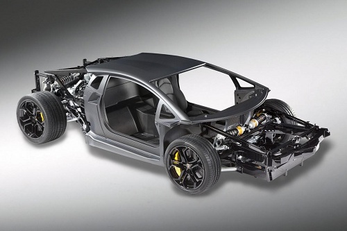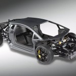 (Provo a farvi venire l’acquolina in bocca) Dopo aver visto il nuovo propulsore 6,5 litri V12, dopo aver conosciuto il sistema di sospensioni push-rod, dopo aver osservato la trasmissione ISR automatica, dopo aver giudicato la monoscocca in fibra di carbonio, abbiamo oggi la possibilità di studiare il telaio della nuova Lamborghini Aventador LP 700-4: nella confezione vengono compresi la cella centrale, che protegge l’abitacolo, i telaietti in alluminio nella parte anteriore e nella zona posteriore, il motore benzina da 700 cavalli e 690 newtonmetri di coppia massima, gli ammortizzatori ancorati alla scocca, il cambio sequenziale a doppia asta, l’impianto di scarico e i terminali centrali, gli pneumatici (già muniti dei cerchi in lega), l’impianto freni in carboceramica (con pinze gialle).