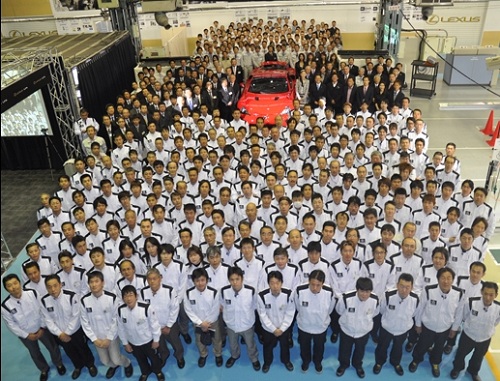 La linea di montaggio della nuova Lexus LFA (molto più artigianale delle restanti automobili comuni della gamma) si è animata lo scorso 15 dicembre e solo ieri, dopo oltre un mese di lavorazione all’interno dello stabilimento di Motomachi, in Giappone, il primo esemplare della supercar nipponica del brand nobile di Toyota è stata ultimata dalle maestranze: nell’immagine, come si noterà, chiunque abbia collaborato alla produzione della prima unità di Lexus LFA, di rosso vestita, è lì, accanto al frutto del proprio sudore.