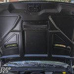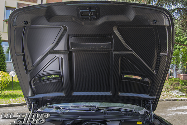 Due posti (e due persone) in più, però, comportano un aumento del peso vettura. Grazie a un sapiente uso dei materiali la nuova Maserati MC Stradale 4 posti conserva quasi lo stesso peso della versione due posti (circa Kg 1700). Una delle componenti che hanno permesso di mantenere i pesi simili tra la “vecchia” e la nuova MC Stradale è il carbonio che non manca nella vettura. Specchietti, volante, appendici aerodinamiche, sedili anteriori e soprattutto il cofano motore (sporcato dalla nostra prova come mostra l’immagine) con presa d’aria ben in vista. Interamente in carbonio con una trama più sottile all’esterno e più importante all’interno, è uno degli artifici di Maserati per ridurre il peso della vettura non rinunciando a linee e resistenza.