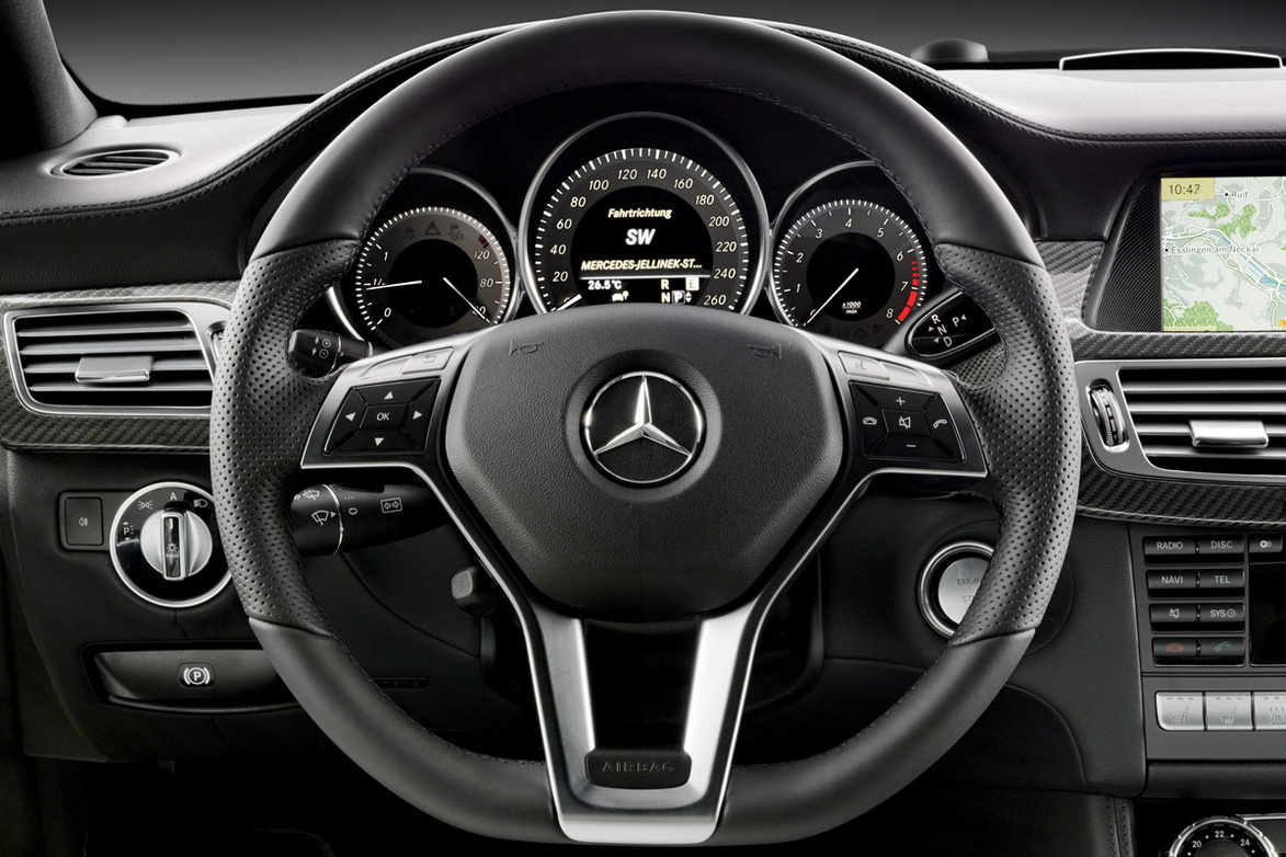 A dispetto, come detto in precedenza, della forma voluttuosa esterna, l’interno tradisce una sonora dipendenza dallo scaffale comune. Risente di un’omologazione generalizzata. Su di lei si ripercuotono tratti rigidi: consolle centrale verticale, comandi della climatizzazione infossati in un loculo basso e – forse – persino poco agevole, cockpit della strumentazione suddiviso in tre strumenti circolari, sportivi, frammentati, schermo della navigazione satelilitare a governare sulla restante parte dell’atmosfera interna. E quel volante: il più riuscito degli elementi, penso io. Coniuga la sportività con l’aplomb necessario ad una vettura come Mercedes CLS.