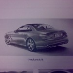 Queste prime immagini confermano quello che avevamo ipotizzato, quando alcuni mesi fa osservavamo e studiavamo le foto spia della vettura impegnata nei test su strada: la linea usata per concepire la settima Mercedes SL della storia è la stessa della nuova Mercedes SLK. La nuova roadster Premium dell’azienda di Stoccarda viene contraddistinta da una matita molto dolce e fluida e da un design semplificato, poco elaborato, pulitissimo, elegante al punto giusto. Nella parte anteriore di questa nuova SL si notano i gruppi ottici a forma di mandorla (tutte le nuove vetture li utilizzano, dal SUV Mercedes ML alla monovolume Mercedes Classe B), mentre nella parte posteriore si mettono in evidenza i fari abbondantemente rastremati. Non mancano i dettagli tipici della tradizione “SL” (questa è l’erede della storica Mercedes 300SL Gullwing, una delle più note vetture con portiere ad ali di gabbiano): cofano anteriore davvero lungo, davvero sporgente, fiancata ordinata, lineare e liscia, presa d’aria al fianco dei passaruota anteriori, terzo volume ristretto, limitato, risicato, andamento del tetto (apribile) in metallo morbido, abitacolo arretrato. Ed all’interno dell’abitacolo?