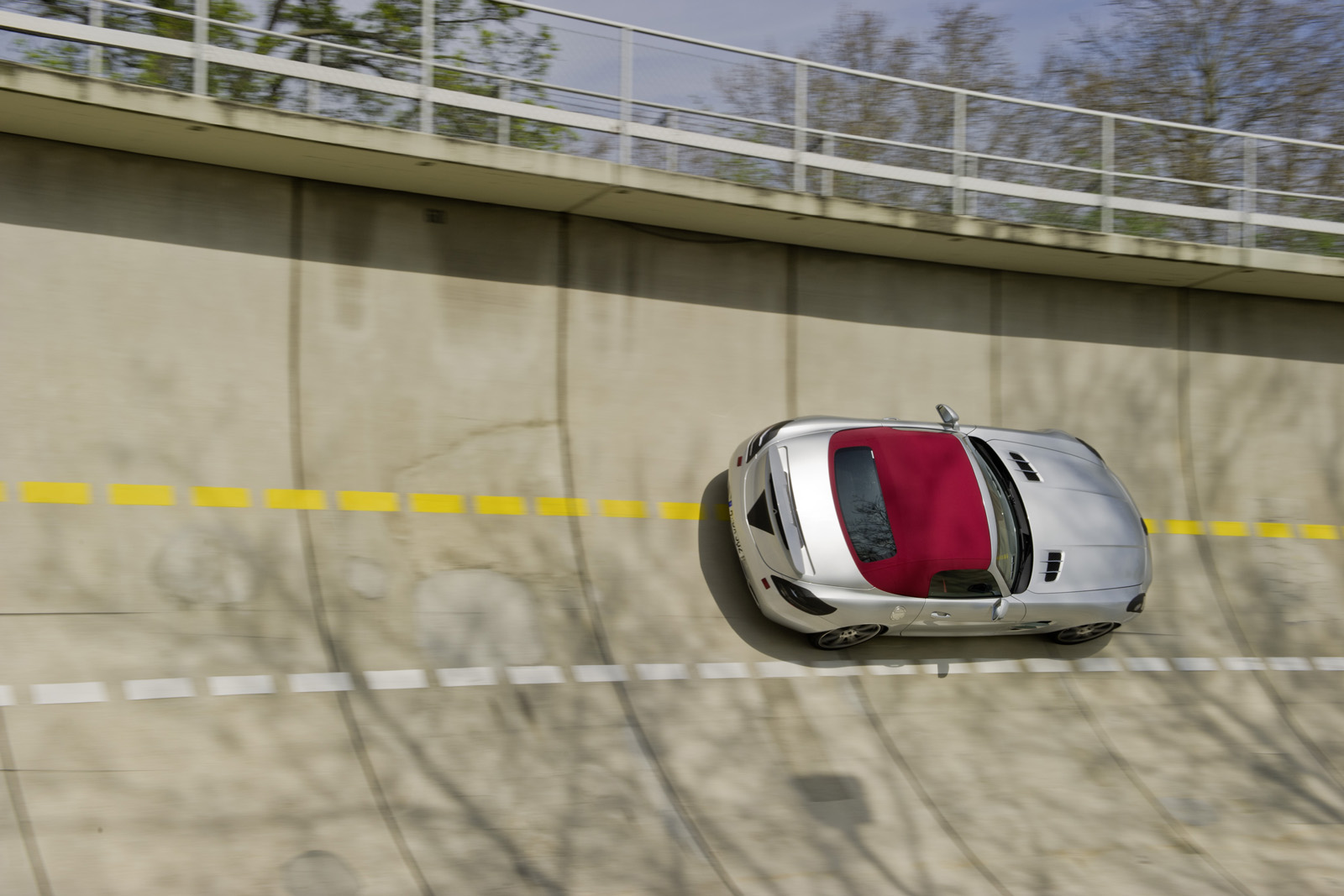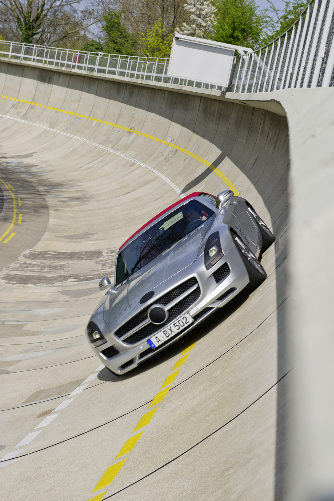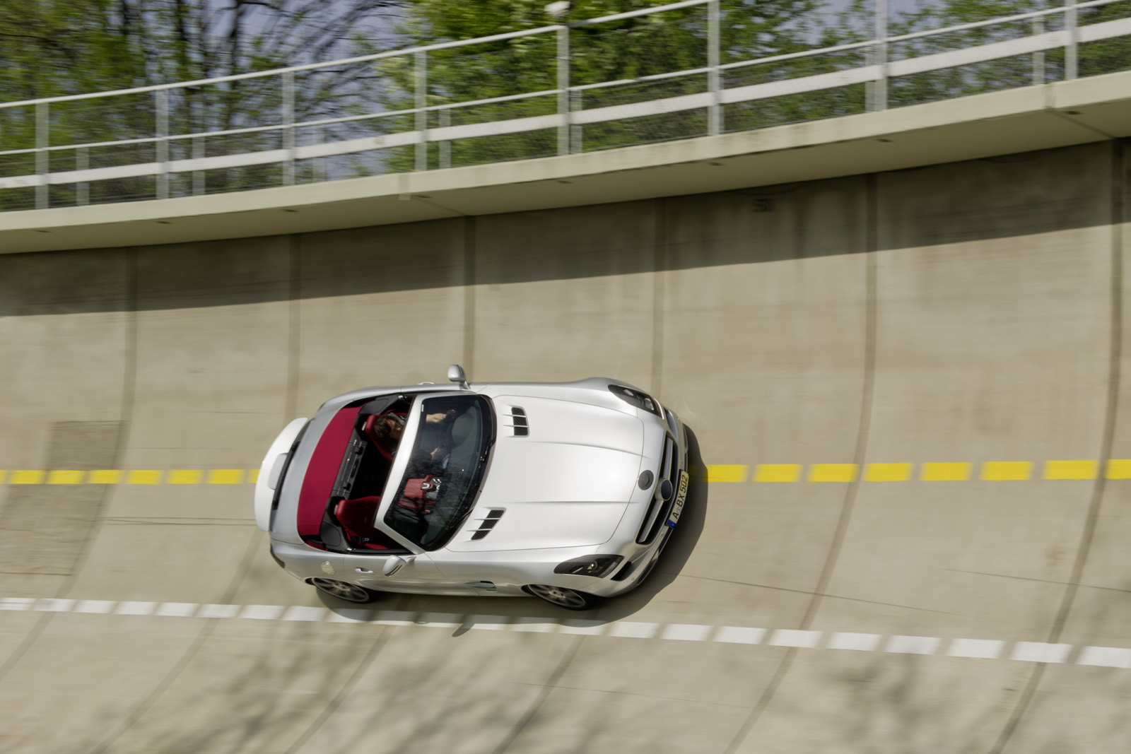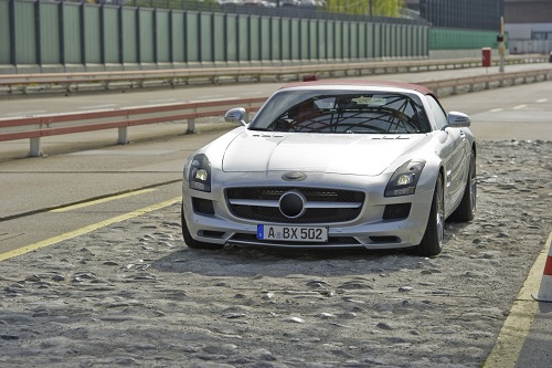 La versione cabriolet di Mercedes SLS AMG Roadster non ha poi molti segreti ai nostri occhi: l’abbiamo seguita, infatti, in lungo ed il largo, durante i test su strada. La vera novità è, senza dubbio, l’introduzione di un tetto in tela (un mutamento che ha mantenuto piacevole l’aspetto stilistico della supercar di Stoccarda e che non ha rovinato il sapore un po’ d’epoca che contraddistingue il modello), che copre l’abitacolo e che ha costretto gli ingegneri Mercedes a modificare la struttura delle portiere: ora, nel caso di SLS AMG Roadster, non si aprono più verso l’alto, a livello verticale, bensì verso l’esterno, a livello orizzontale.