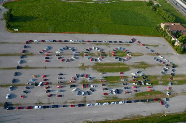 Per dare un tocco di spettacolo in più ieri alla Fiera di Brescia, prima della partenza della sfilata, 375 auto si sono parcheggiate in una composizione del tutto particolare, quella che vedete in foto con la scritta 1000 miglia e la freccia che indica la “griglia di partenza”. Un mega-mosaico che ora potrebbe persino entrare nel Guinness dei Primati.