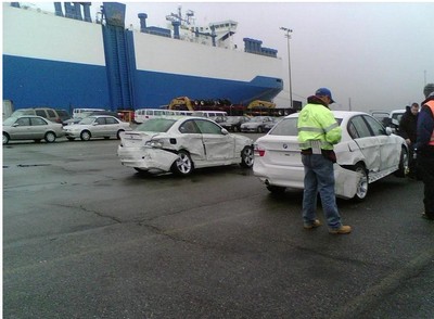 Come mai? Date un’occhiata alla foto qui sopra e datevi un’esaustiva risposta da soli! Pare infatti che a causare questo clamoroso disastro sia stata una nave mercantile che, per ragioni a noi ancora sconosciute, è andata a finire dritta dritta nel parcheggio delle automobili (BMW per la precisione) distruggendo praticamente qualsiasi cosa trovasse davanti a se nel suo erroneo cammino sulla terra ferma.