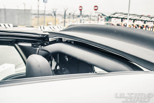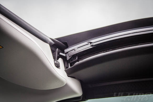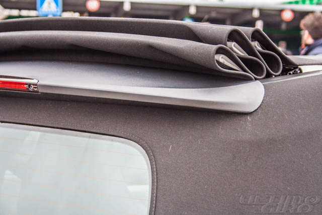 Durante la guida abbiamo avuto modo di notare la solidità della capote, strutturata in tre differenti strati. L’interno realizzato in poliestere e cotone, l’esterno di tessuto poliacrilico, con uno strato intermedio di caucciù. Presente, ovviamente, anche un lunotto termico in vetro.
