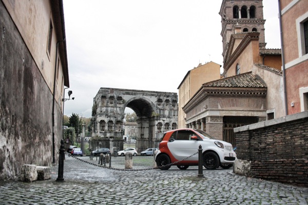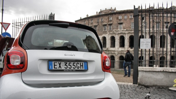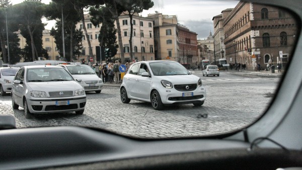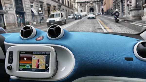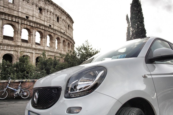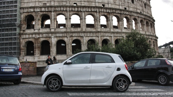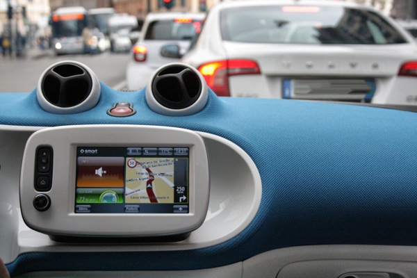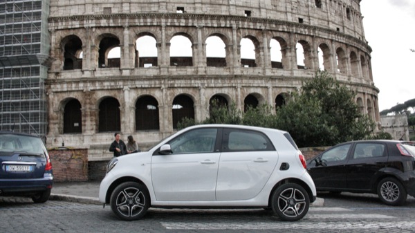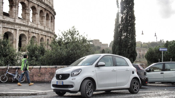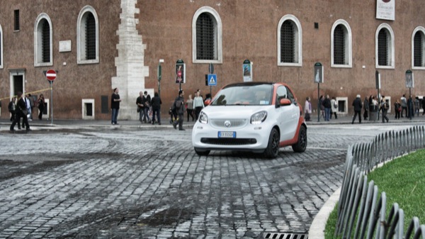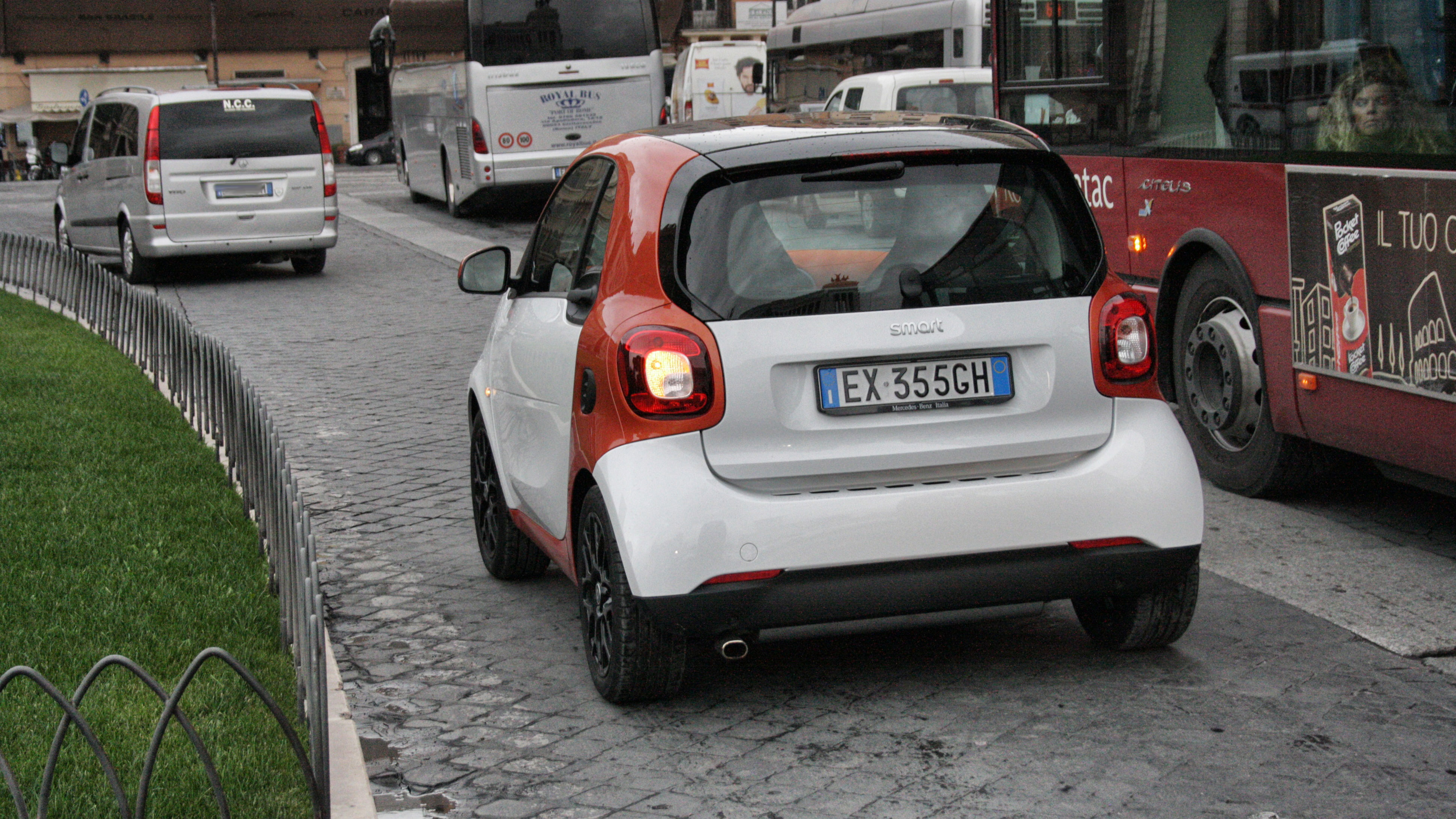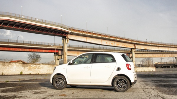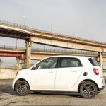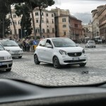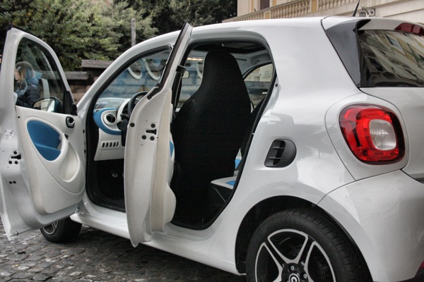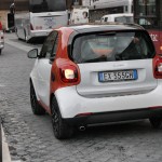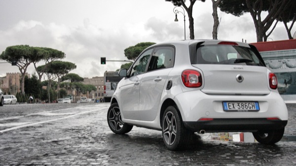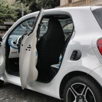 Così la nuova smart forfour non esagera con le dimensioni: meno di metro si aggiunge in lunghezza rispetto alla fortwo (per l’esattezza, sono 3,49 m), ma si guadagnano due sedili aggiuntivi (reclinabili totalmente anch’essi) senza inficiare la maneggevolezza del segmento. Anche la nuova smart forfour, infatti, ci ha dimostrato invidiabilissima capacità nel traffico: con un diametro di volta di 8,65 metri, quasi si avvicina alla vecchia fortwo. Insomma, guidando nelle strade della capitale con la forfour siamo stati piacevolmente sorpresi dalla sensazione avvertita, ovvero quella di esser rimasti a bordo di una fortwo, pur guadagnando abitabilità nel veicolo (75% di Body Space Index). Ad un certo punto avevamo quasi dimenticato di avere a disposizione le portiere posteriori, a dimostrazione che forfour offre dimensioni maggiori senza far avvertire, o quasi, la differenza. Le giuste dimensioni, dunque, per tragitti urbani e non: a chi se lo chiede, nella forfour ci entra anche un televisore da 42 pollici imballato (almeno a detta di Mercedes) ed una scatola di traslochi. Una small car, dunque, ma non estremamente small.