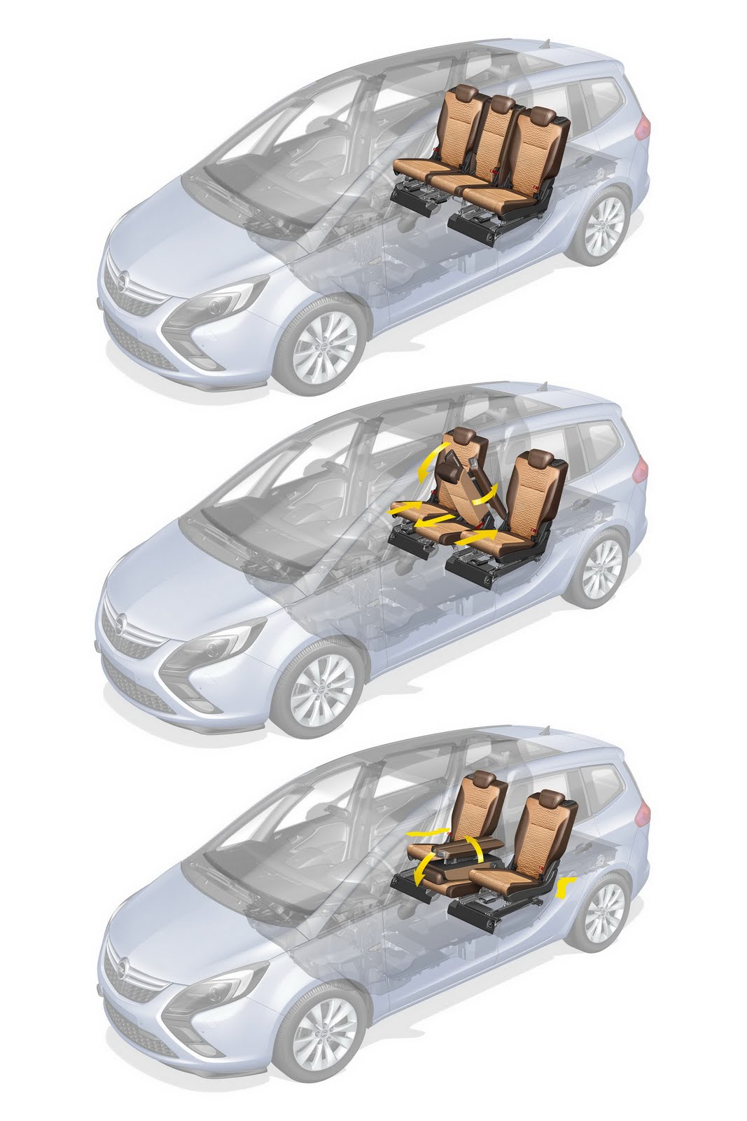 La nuova Opel Zafira Tourer viene dotata di un passo più ampio, incrementato di 57 millimetri, che permette maggiore comfort all’interno dell’abitacolo, dove sono sistemate sette poltrone singole, secondo lo schema della casa automobilistica definito Flex7: tutte le sedute possono essere spostate o ripiegate singolarmente, fino a creare un ampio vano di carico liscio di 1.860 litri (che diventano 710 se si reclinano soltanto le due sedute della terza fila o 65 con tutte le poltrone in uso). La seconda fila di sedute di Opel Zafira Tourer potrà spostarsi su una corsia lunga 210 millimetri e potrà ruotare di 180° all’indietro (il sistema viene chiamato Lounge Seating system). Alla luce di tutti questi dettagli, lo spazio abitativo si fa molto versatile ed adatto ad un grande ventaglio di situazioni: la nuova Zafira può essere tanto un confortevole veicolo da viaggio quanto una capiente vettura da trasporto.