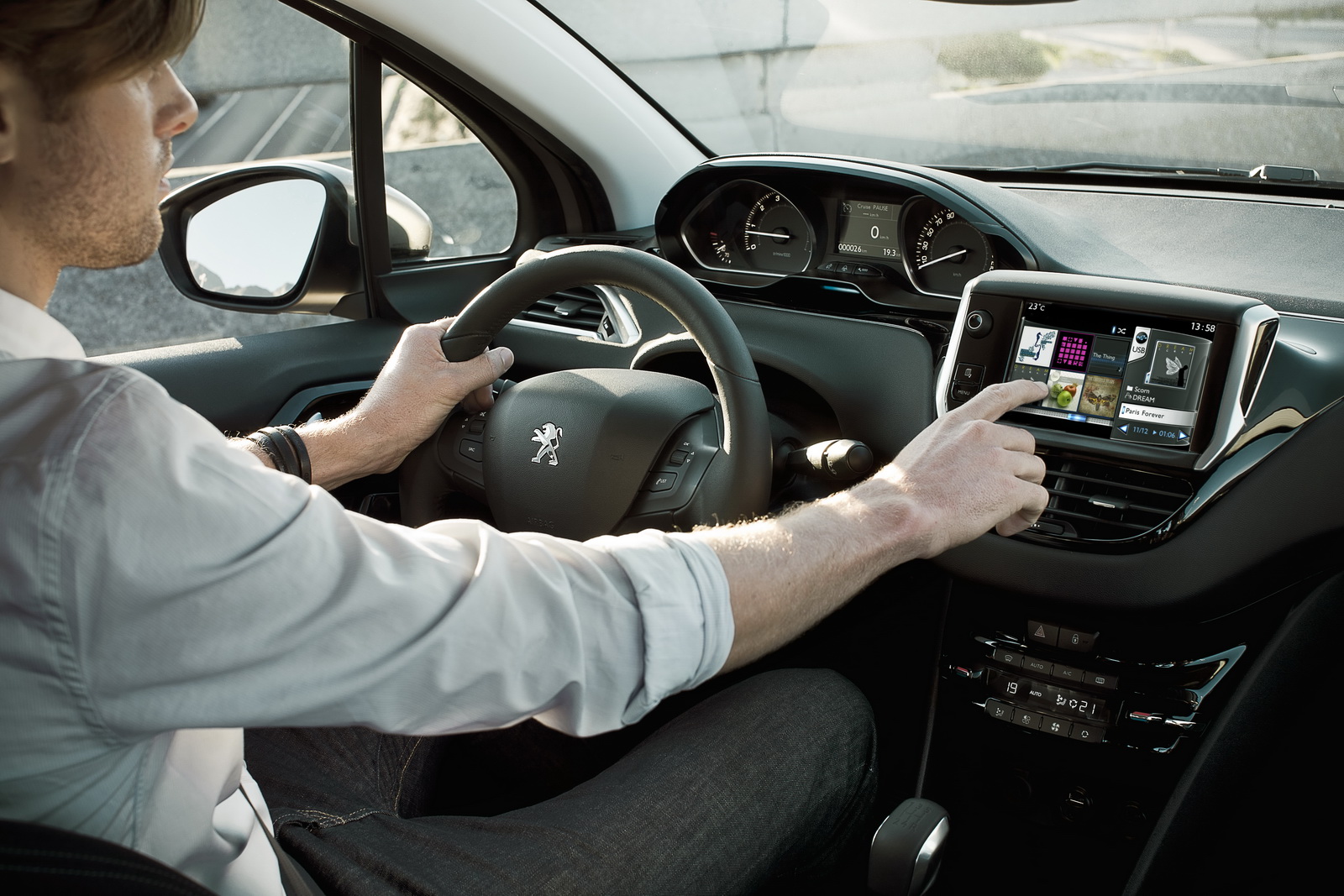 All’interno dell’abitacolo della nuova Peugeot 208 ci accoglie un sapore tutto nuovo: cura ed attenzione al dettaglio ci fanno credere di essere a bordo di un veicolo di ben altre dimensioni e di ben altro costo (anche se non sappiamo, con certezza, quanto costerà il modello del Leone). Sebbene quello nelle fotografie sia sicuramente un esemplare multi-accessoriato, ci colpiscono le fattezze della plancia, che si divide tra il cockpit strumentazione insolitamente arretrato, lo schermo touch-screen di grandi dimensioni, i comandi del sistema di climatizzazione (nella parte di consolle più nascosta ed inferiore) ed il volante di forma molto “pregiata”.