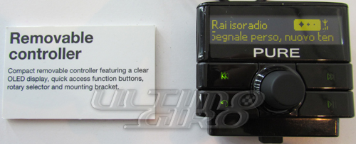 Pure Highway 300Di, particolare del removable controller - UltimoGiro.comInfine (in realtà nel kit sono inclusi anche i vari supporti per il montaggio), il controller removibile posizionabile in fase di installazione nel punto della plancia più comodo all’automobilista. Da qui si potrà comandare la radio digitale, leggere sul suo display le informazioni trasmesse dalle varie emittenti e interagire con il lettore Mp3 o il disco rigiro (o “chiavetta”) USB eterno.