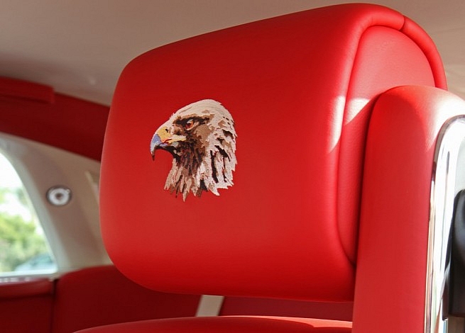 Rolls-Royce Phantom Coupé Bespoke Shaheen offre una colorazione della carrozzeria in cromia bianco marchesa ed un interno in pellame rosso Seashell, ma può essere riconosciuta attraverso il simbolico falco intarsiato in ottone, nell’abitacolo, e da quello di grandi dimensioni ricamato sui poggiatesta della coupé sportiva britannica, disponibile in 11 tonalità e realizzato con 21.011 punti.