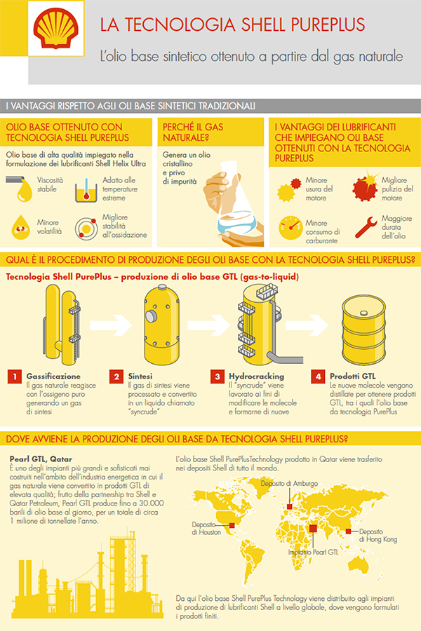 Grazie al nuovo e rivoluzionario metodo di produzione che prende appunto il nome di Shell PurePlus Technology, è possibile produrre olio lubrificante sintetico partendo da gas naturale. Questo permette di avere alla fine del processo produttivo un olio cristallino e pressoché privo di impurità. Di seguito vi proponiamo un’innografia che riassume il processo produttivo.