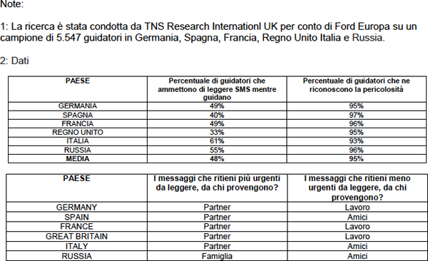 Alzi la mano chi non ha mai letto un SMS alla guida. Su un campione di dieci italiani, più di sei dovrebbero alzare la mano stando ad una ricerca svolta da TNS Research International UK per conto di Ford Europa e, dato ancor più crudele, il popolo dello Stivale sembra essere il più indisciplinato del Vecchio Continente. I più disciplinati, invece, i sudditi di Sua Maestà (gli inglesi) che hanno tra i loro lettori di SMS poco più di tre guidatori su dieci.
