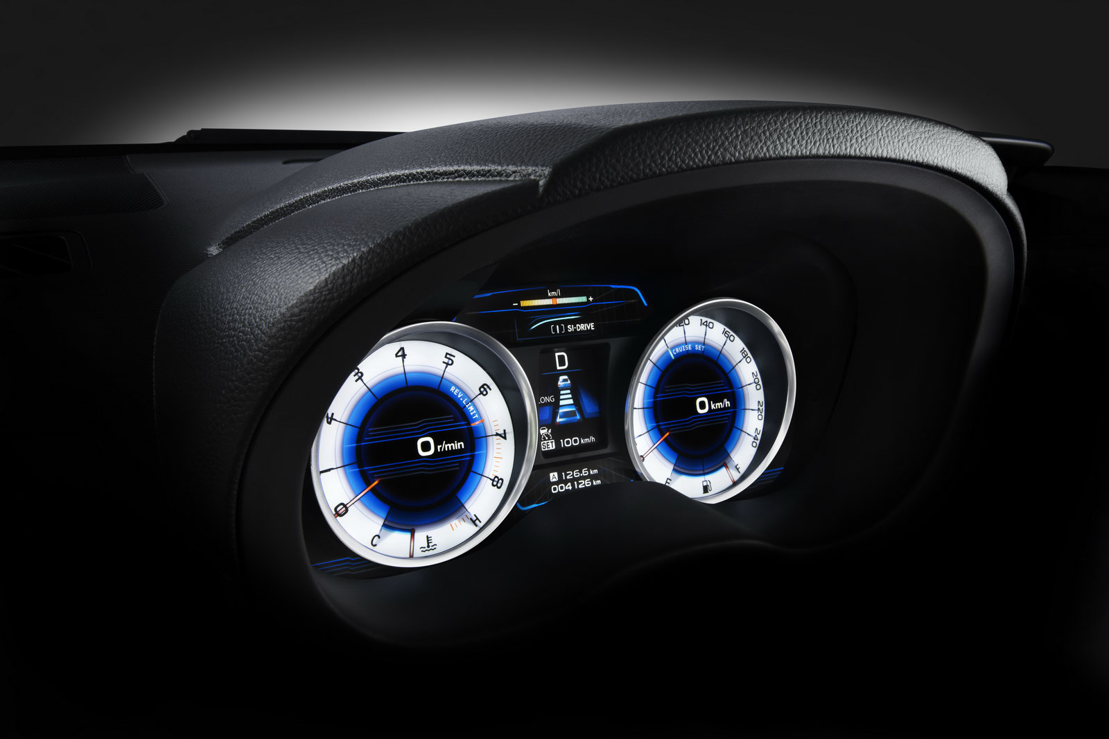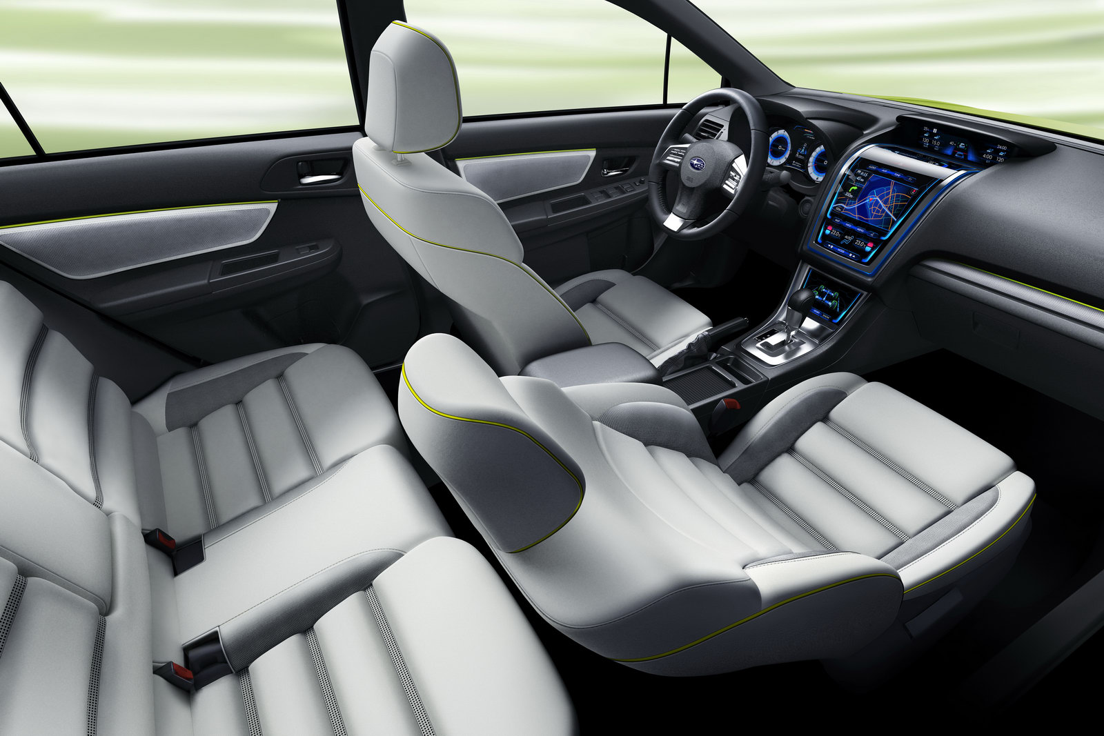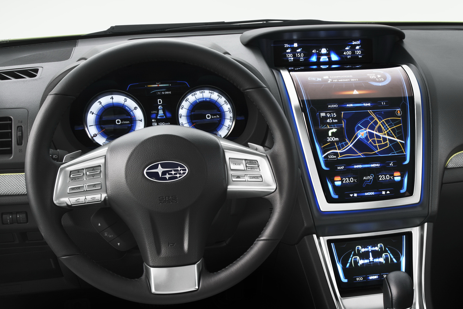 La nuova Subaru XV Concept misura 4.450 millimetri in lunghezza, 1.800 millimetri in larghezza e 1.620 millimetri in altezza, con un passo pari a 2.635 millimetri: le dimensioni dicono che il modello – è vero – è un crossover, quindi è alto da terra, ma anche che ha una carrozzeria in nessun caso rigida e massiccia, imponente e possente. Tutt’altro: la nuova Subaru XV Concept viene caratterizzata da un aspetto morbido, denso, gommoso, simile a quello della concept car Impreza che venne presentata durante l’anno passato dalla casa automobilistica nipponica (che sta cercando di dare forma e vita ad un linguaggio stilistico comune per tutta la propria gamma). La linea, grintosa, dissimula il fatto che XV sia un SUV (senza dubbio, i cerchi in lega da 19 pollici rendono la vettura aggressiva, così come i montanti posteriori). All’interno dell’abitacolo della nuova concept car Subaru, invece, si annusa un’aria molto matura, molto curata e futuristica (per effetto del grande schermo al centro della plancia).