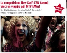 Suzuki ci sa fare anche con la musica e lancia un nuovo concorso sulla Swift FAN Award, i partecipanti dovranno andare sul sito www.swift-fanaward.it caricare le immagini e i video , i primi 10 più cliccati verranno giudicati da una giuria di MTV. Il vincitore finale potrà partecipare com ospite VIP con un amico alla cerimonia di premiazione degli EMAS che si svolgerà il 7 Novembre a Madrid. Bisogna affrettarsi per le iscrizioni, perché il concorso terminerà il 17 Ottobre, ma sarà possibile esprimere il proprio voto fino al 25. Il 27 verrà pubblicato il vincitore del concorso. Non è la prima volta che la Suzuki si lancia in questi atti musicali, già con la New Swift FANtastic Sounds Battle era accaduto la stessa cosa, solo che i concorrenti dovevano cantare alcune strofe di una canzone in favore della piccola auto giapponese.