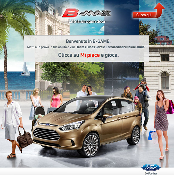 Sulla pagina Facebook di Ford Italia è iniziato il B-GAME, un concorso che permette di scoprire alcune caratteristiche della nuova B-MAX. Ogni giorno saranno messe in palio delle iTunes Card da € 15 ed i 30 migliori punteggi della classifica di ogni gioco, parteciperanno all’estrazione di cinque ricariche iTunes da € 100.