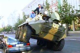 Lituania, sindaco Zuokas usa carro armato su vecchia Mercedes, come propaganda per la lotta al parcheggio