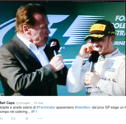 Al GP d’Australia e scusate se è poco, abbiamo visto un grandissimo Arnold Schwarzenegger. Torna Terminotor, torna urlante e lo fa sul palco del GP d’Australia, il primo della stagione automobilistica. Un mito, in grado di offuscare anche il campione di giornata. Hamilton intanto si era lasciato fotografare più tamarro che mai con una catena al collo a dir poco vistosa, dei tatuaggi intensissimi e il soli sguardo torvo che ha sostituito con la versione “tanto imbarazzato” davanti a zio Schwarzy.