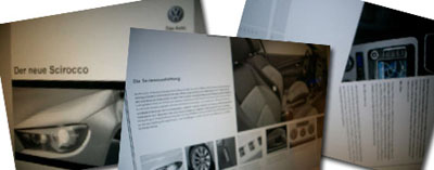 Proprio in questi giorni sono apparsi alcuni scatti di una brochure inerenti la nuova Volkswagen Scirocco. Dalle immagini rubate purtroppo non si capisce praticamente nulla, sono foto del catalogo, in lingua tedesca, della nuova Volkswagen, della quale si sono ormai visti da tempo numerosi prototipi nelle località più disparate e nelle condizioni climatiche più proibitive come ormai si accingono a fare la maggior parte delle case automobilistiche. Ma sembra con un livello di camuffatura troppo invadente per poterne cogliere il design definitivo.